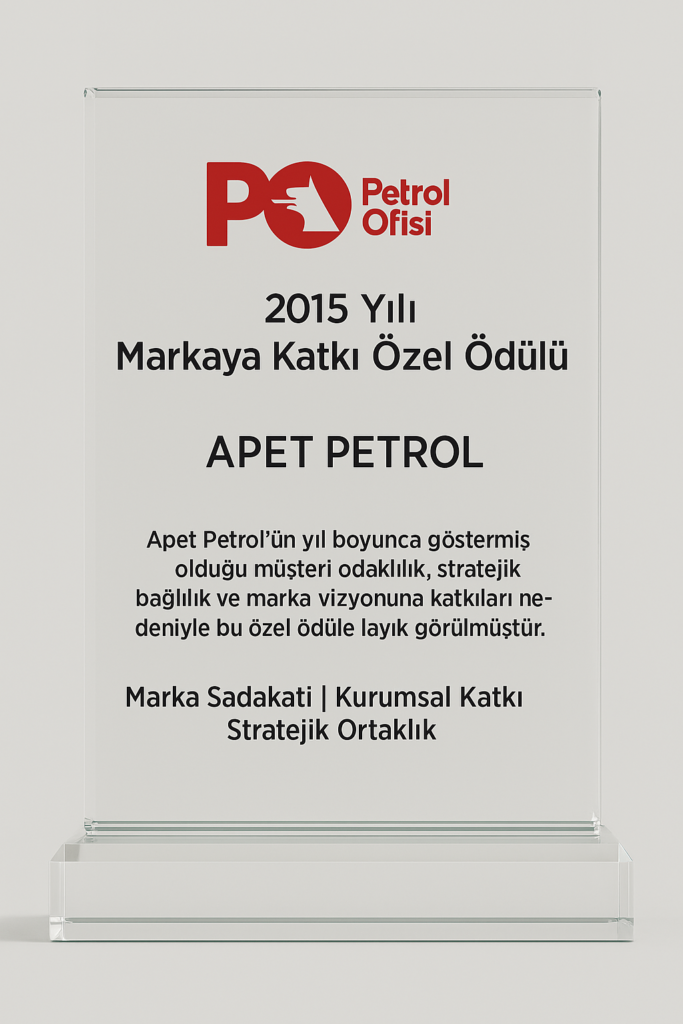Petrol Ofisi tarafından 2015 yılında Apet Petrol’e layık görülen “Markaya Katkı Özel Ödülü”, sadece bir ödül değil; sürdürülebilir iş birliğinin, istikrarlı büyümenin ve stratejik bağlılığın güçlü bir sembolüdür.